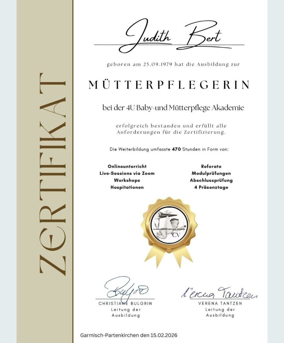 Meine Ausbildung habe ich bei der 4U Baby- und Mütterpflegeakademie in Garmisch-Partenkirchen gemacht. Ich bin zertifiziertes Mitglied im Berufsverband Mütterpflege Deutschland e.V.