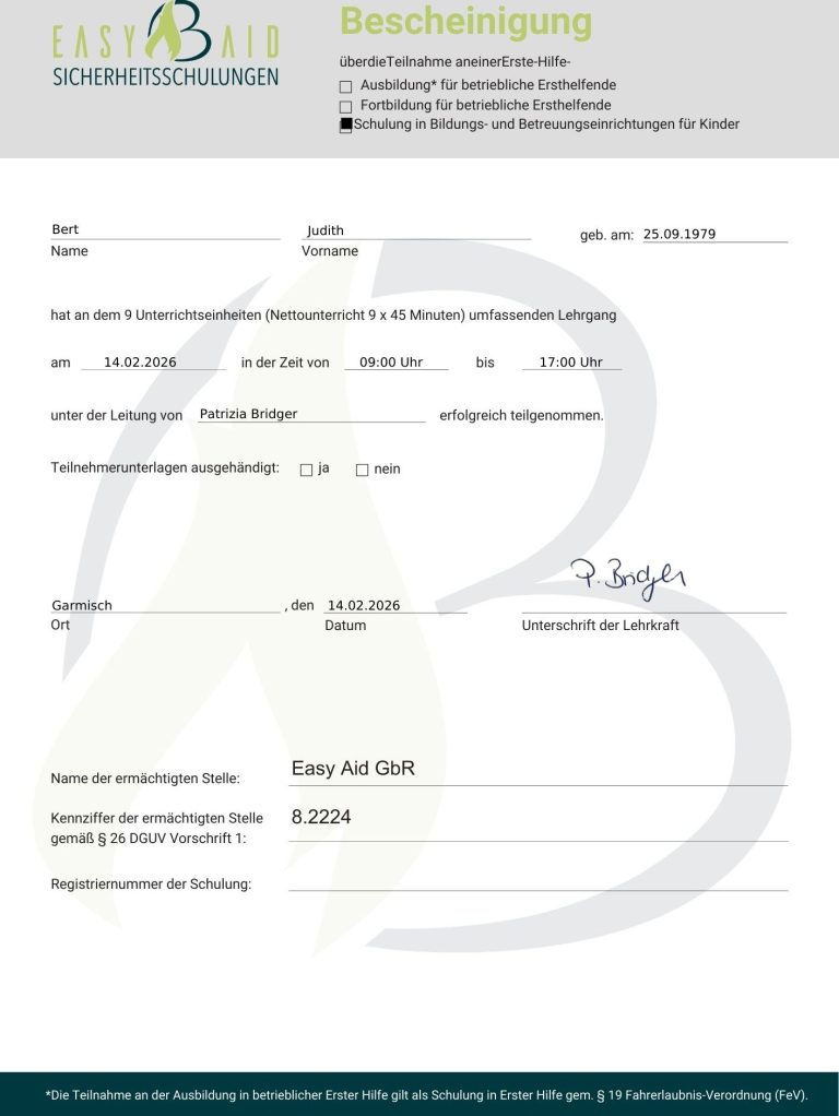 Teil meiner Ausbildung ist auch, mich regelmäßig fort- und weiterzubilden. Meine Kenntnisse in Erste Hilfe sind aktuell. Ich werde sie alle 2 Jahre auffrischen, um in Not- und Hilfesituationen adäquat helfen zu können.